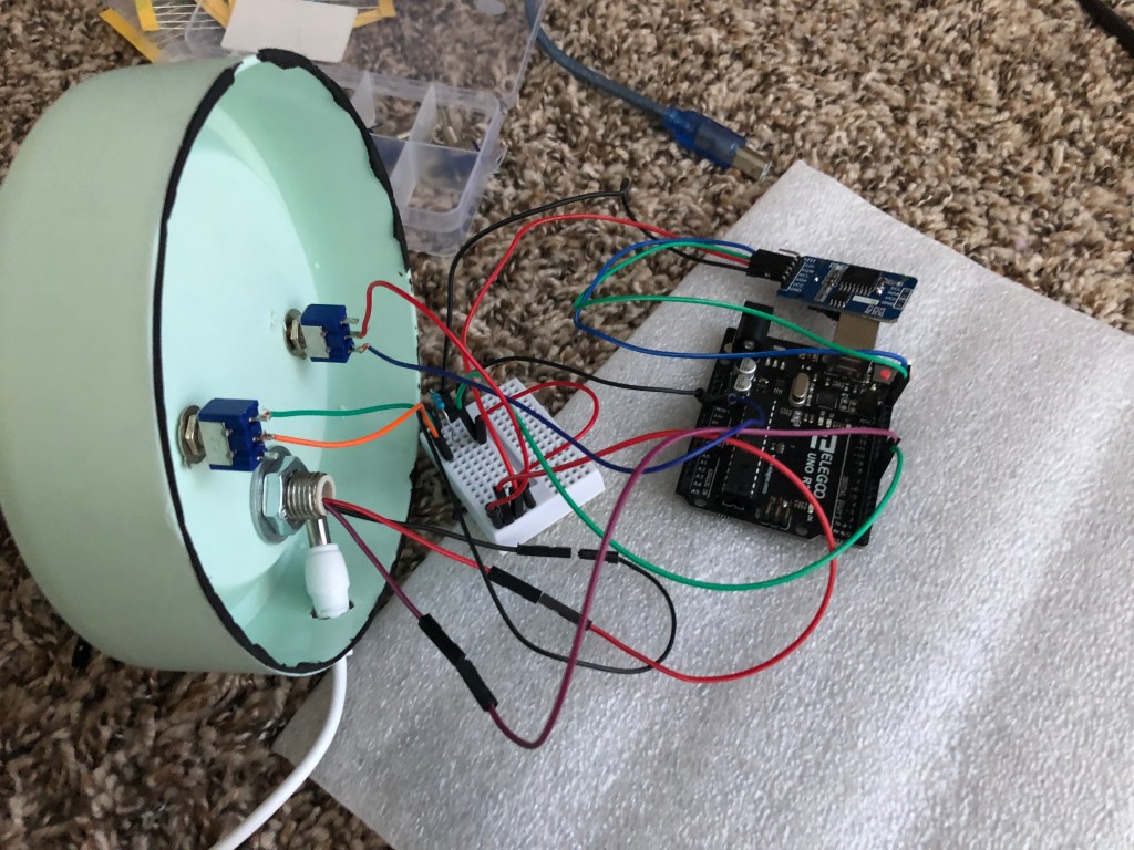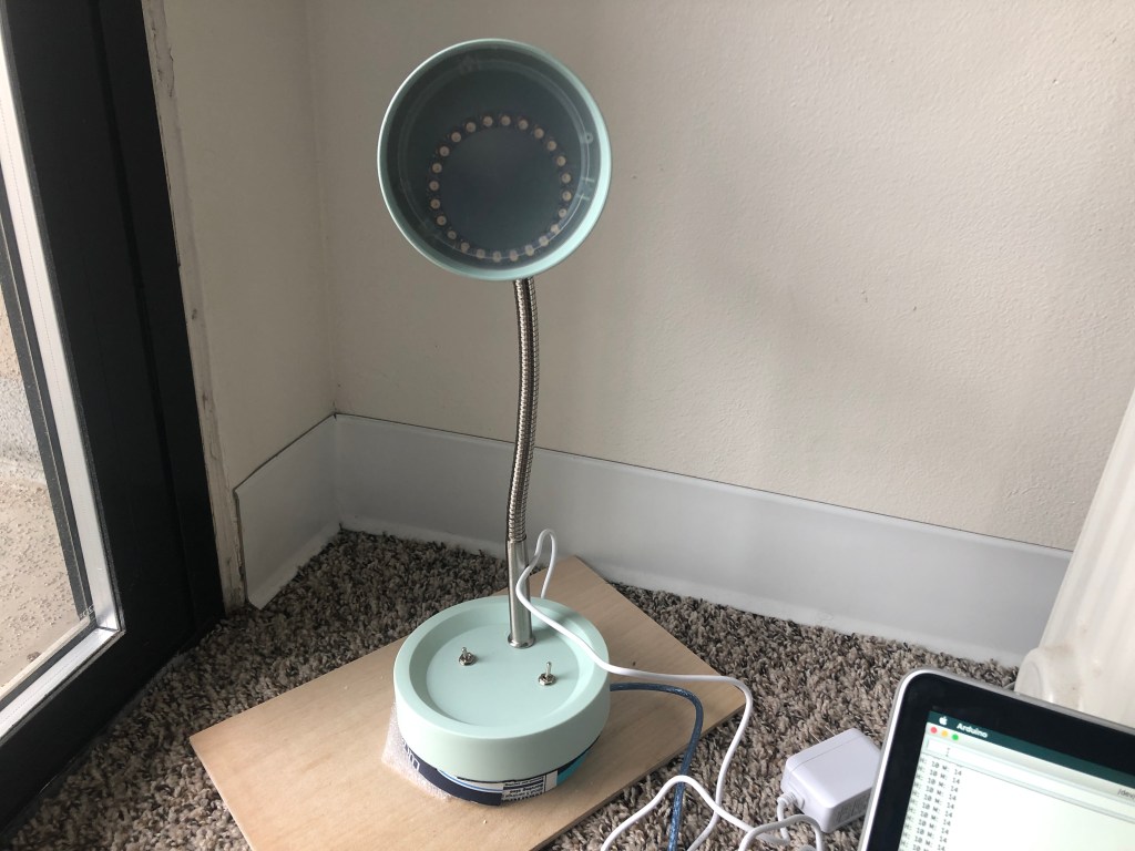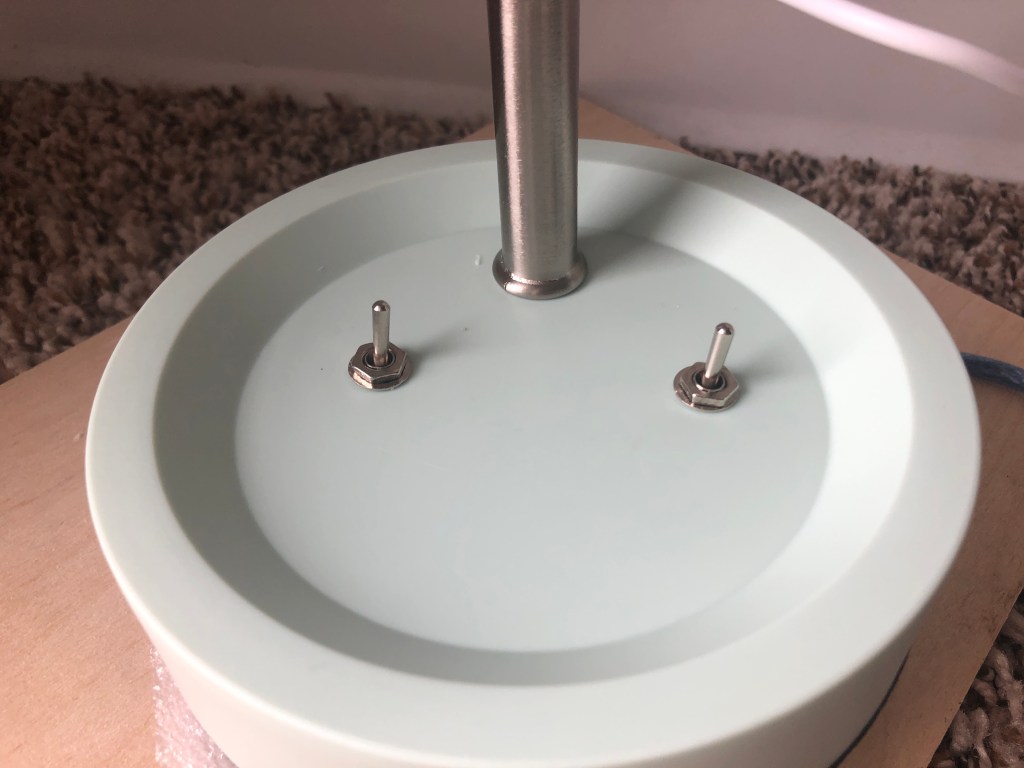 The body of the lamp is from a standard target desk lamp. The desk lamp was removed of its lights and wires, so it was only the head, the stand, and the neck (bendy metal part that connects the stand and head.) This is set aside and used later. The neopixel must be tested by connecting it to ground, 5v, and data in, with test code from adafruit neopixel simple, under examples in the arduino desktop app. Once you are sure the neopixel is working, it is time to figure out the real time clock. The real time clock (RTC) should have a battery. If it doesn’t, you need to buy one. Connect the RTC to the arduino, using jumper wires, connect the SCL on the RTC to the SCL port on the arduino. SDA on the RTC should be connected to the SDA port on the arduino. The VCC on the RTC should be connected to 5V on the arduino, and GND on the RTC to ground on the arduino. This needs to be set using DS3231_set in the DS3231 examples in the arduino desktop app. Open the serial monitor and make sure that the time matches up with your clock on your computer. The battery needs to be in, and the wires need to be hooked up. If for some reason the RTC ever changes from the time you previously set it to, just repeat this step, and it will go back to the right time.