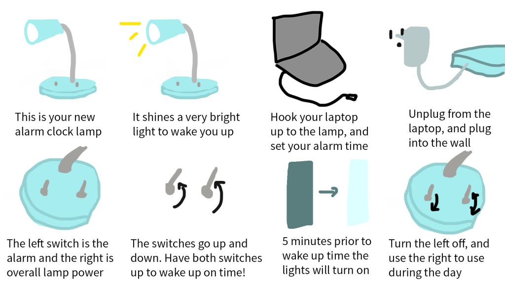 Overall, the RTC keeps track of the real time, sends it to the arduino, the arduino checks the code that was last uploaded and compares the RTC to the number inputted for the alarm time. Five minutes before the alarm time, the neopixel begins to light up (controlled by pin 7), going from 1 to 255 by the time the alarm was set. One toggle switch controls if the alarm light is on or off, the other controls if the entire lamp is on or off. After a certain point, the lamp can be turned on for use as a normal lamp.