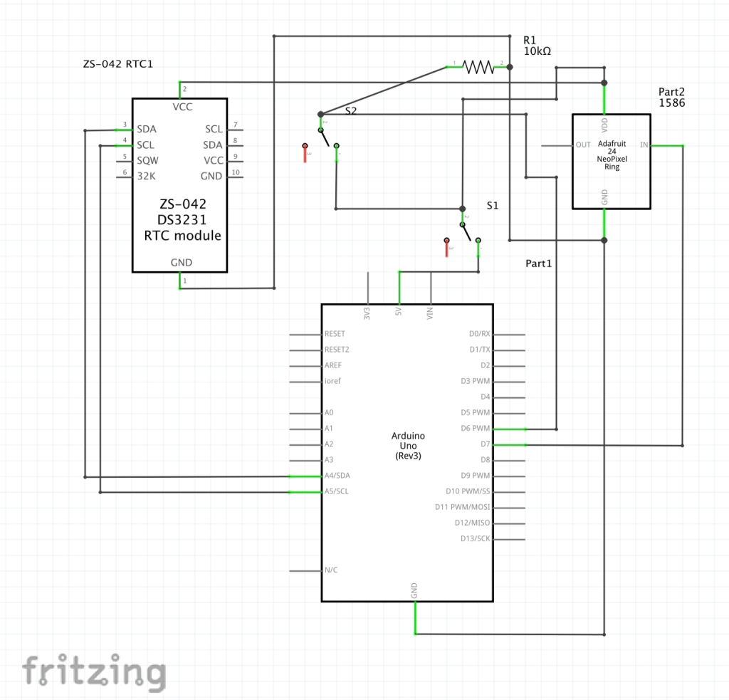 Because both are working, it is time to put everything together. This can all be seen in the digitally drawn schematic below. Ensure you do not plug in the arduino until needed. The toggle switches need to be attached to wires, be it solder or trickily wrapping wire around the bottom, like I did. There only needs to be two wires, one in the middle of the toggle switch and one on the outside. There is no need for 3 wires. On toggle switch 1, the outside wire needs to go into the 5v on the arduino uno board. The middle wire toggle switch 1 needs to go into the far left column (column 1) of your small breadboard. From there, the neopixel’s 5v wire needs to be in column 1, same as the middle wire of toggle switch 1. The real time clock’s VCC needs to be connected to column 1 as well. Finalizing this column, use a jumper wire to connect column 1 to column 10. Put the middle wire of toggle switch 2 into column 10, and the outside wire to column 11. Put a 10k resistor connecting column 11 and the last column (column 15). Put a jumper wire from column 11 to port 6 on the arduino board. Column 15 is the grounding column, so connect the ground of both the neopixel and the RTC to column 15 with jumper wires. Connect column 15 to the ground port on the arduino board. Connect the “in” hole on the neopixel to port 7 on the arduino board. Then use the code, upload it to the arduino board, and you should be set.