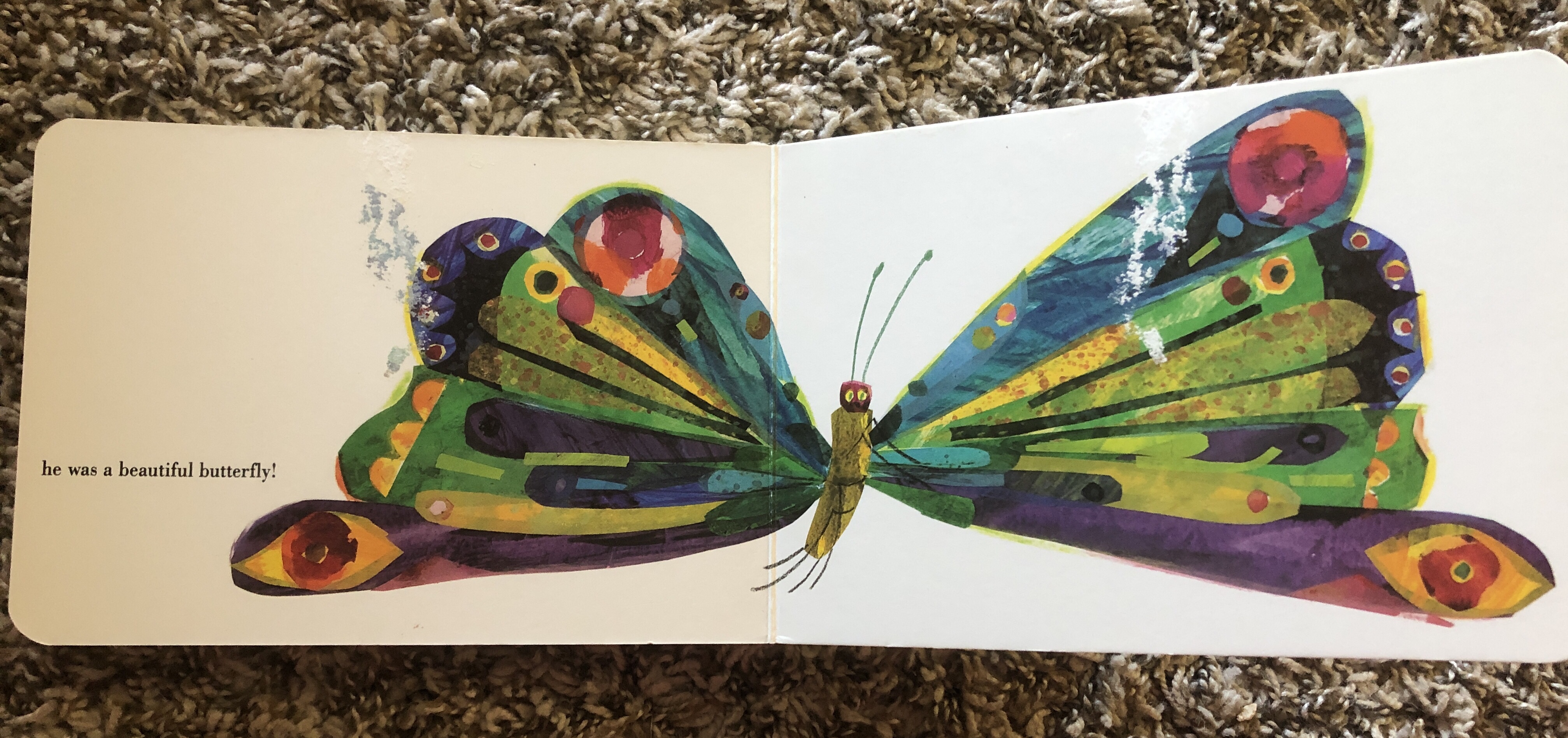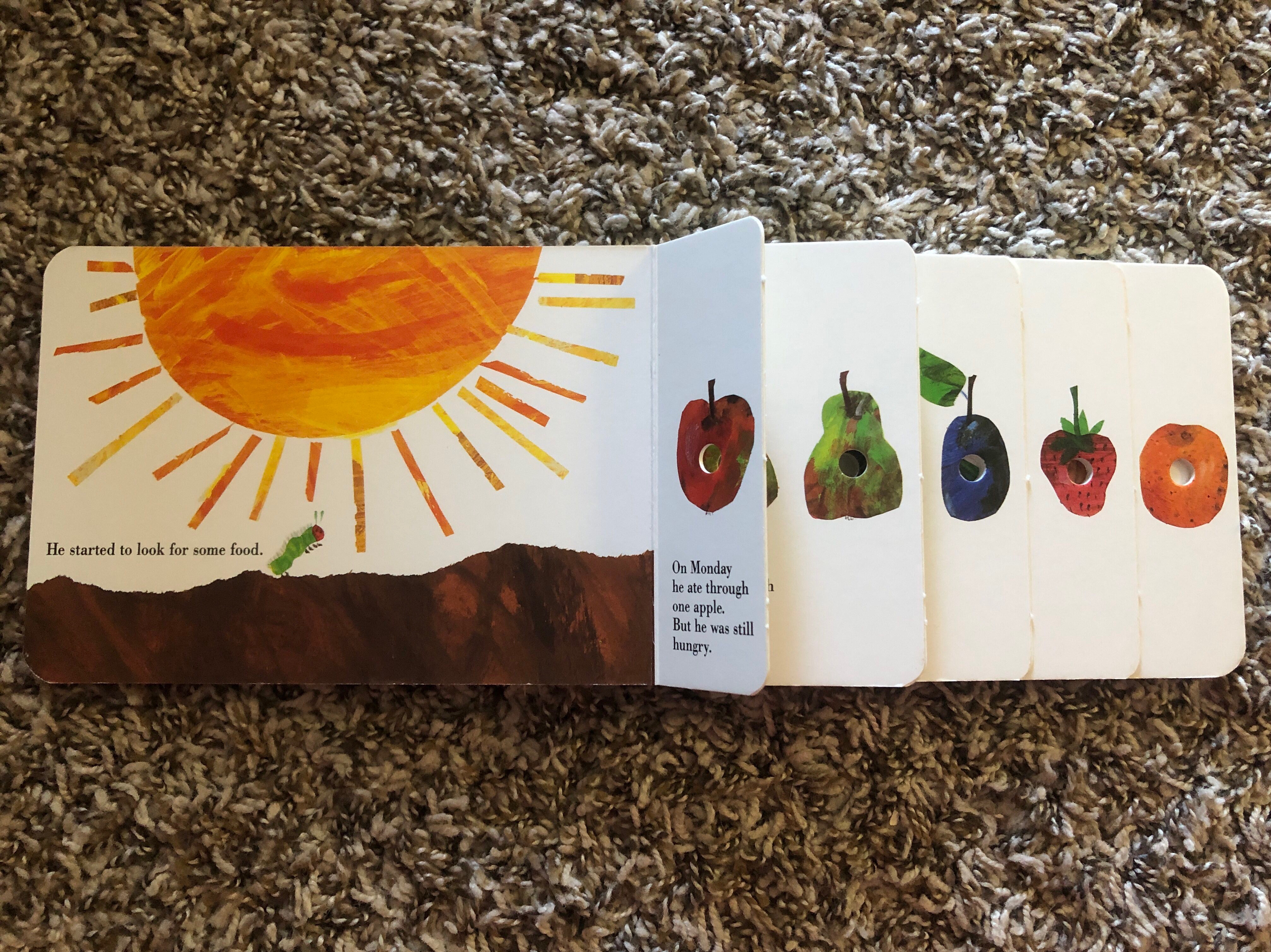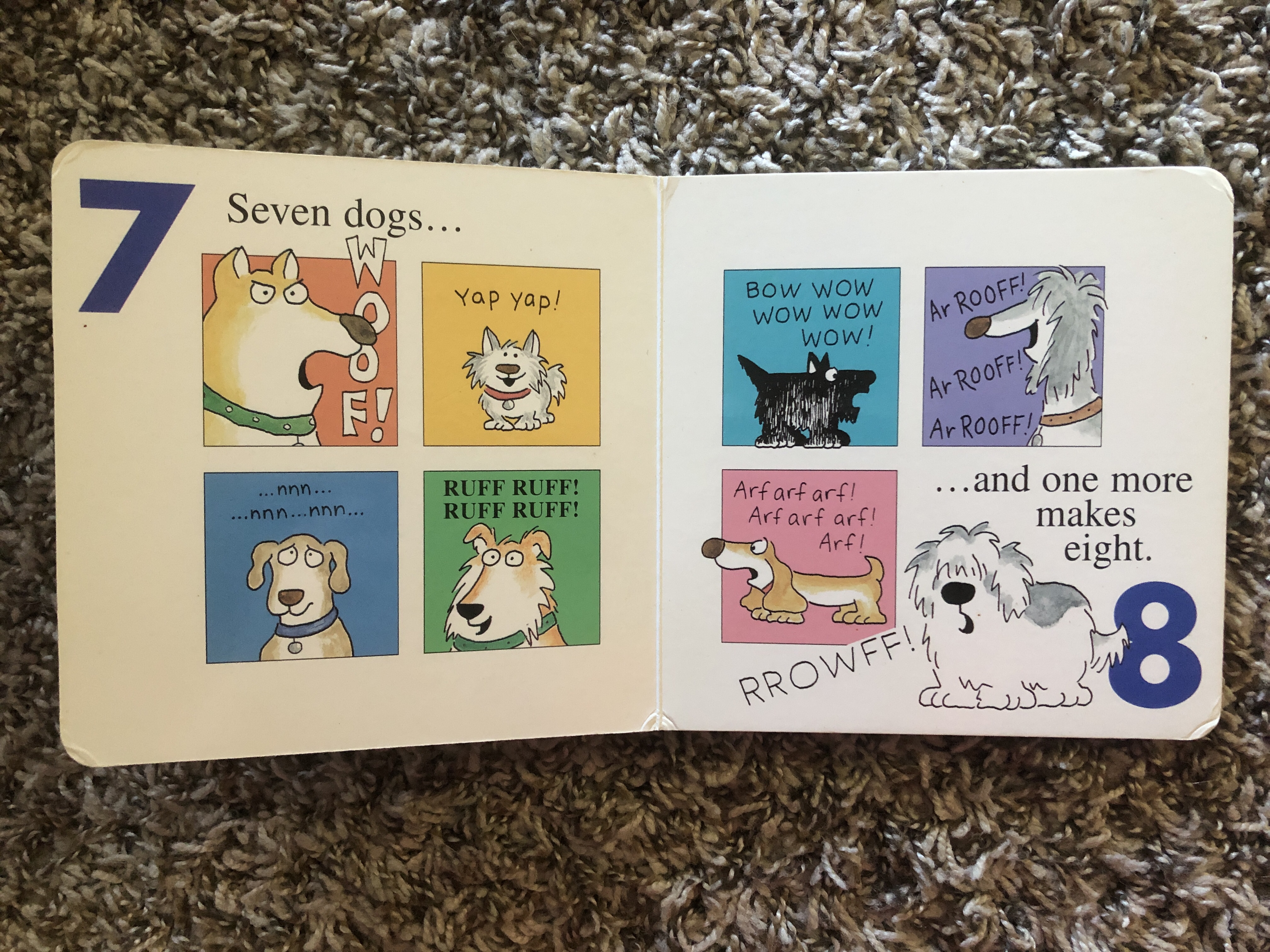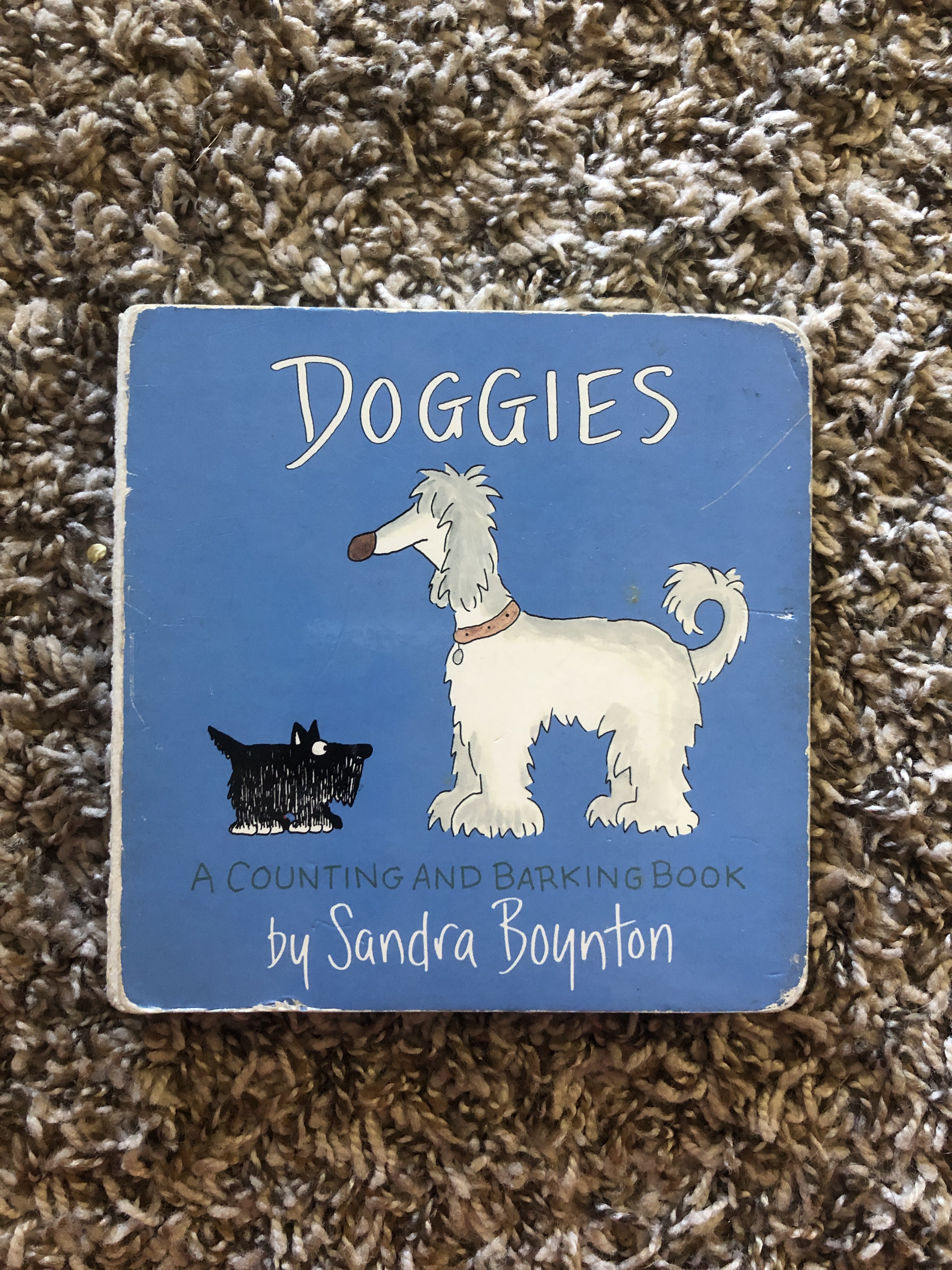 Each of the books has an interactive way of highlighting the content and making it more engaging than just a picture to add to the story. For Wacky Wednesday, the text is minimal, and is more about finding what is wrong with each picture. Whether the teacher was wearing rollerblades or there was a “shoe on the wall, shouldn’t be there at all!” the book has a similar feeling of searing like I Spy or Where’s Waldo where you are looking for something, but also incorporates counting each thing. The Very Hungry Caterpillar has such a fantastic look that is more artistic than Wacky Wednesday, but uses the caterpillar to tell the story. Eric Carle is a fantastic artist and I always love looking at his art in other books as well. His art style is relaxing, for some reason. Doggies is very much a read-aloud book. Each dog that is added as the book goes along has a different bark, so lots of noise is made and fun is had. The dogs look adorable and are overall pretty simple drawings but still expressive and friendly.